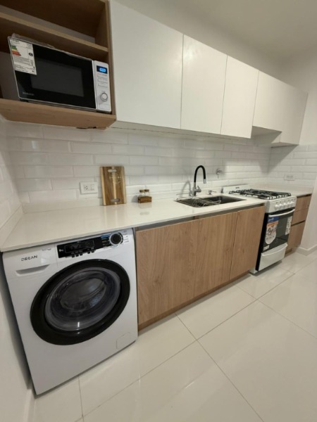 Cocina alargada con mesada en dos laterales y lavarropas